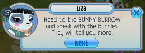1. Liza will appear and start the quest, informing the player that the Phantoms have invaded the Bunny Burrow.